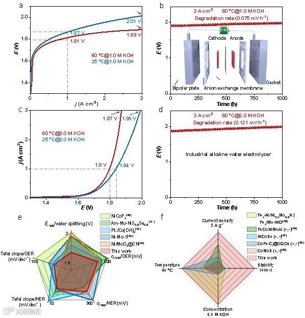 鉴于高电流密度下优异的HER和OER性能,我们组装了以CoNi2S4-Co2P/Ni12P5分别作为阳极和阴极的阴离子交换膜电解槽(AEMWE)和工业碱性电解槽。CoNi2S4-Co2P/Ni12P5-based AEMWE 在25°C/60°C@1.0 M KOH条件下,仅需1.87 V和1.81 V即可分别达到1 A cm-2的电流密度(图5a),优于最近报道的大多数最先进的过渡金属基电催化剂(图5e)。在60°C@1.0 M KOH工业条件下,CoNi2S4-Co2P/Ni12P5-based AEMWE在3 A cm-2的高电流密度下显示出1.89 V的极低电压,其在0.5 A cm-1时显示出较高的法拉第效率(98.2%),即使电流密度增加到3 A cm-1时也保持96.4%的法拉第效率(图S39)。基于CoNi2S4-Co2P/Ni12P5的AEMWE可以在60°C@1.0 M KOH工业条件下稳定工作至少1000小时,降解率为0.075 mV h-1,显示出大规模工业制氢的良好应用潜力(图5b)。此外,CoNi2S4-Co2P/Ni12P5-based工业碱性水电解槽在25°C/60°C和6.0 M KOH条件下,电压仅为1.84 V和1.8 V时电流密度可达到1 A cm-2(图5c)。基于CoNi2S4-Co2P/Ni12P5的工业碱性水电解槽在60°C@6.0 M KOH条件下,在3 A cm-2条件下具有1.87 V的低电位,并且具有1000 h稳定性(图5d,降解率仅为0.121 mV h-1)。