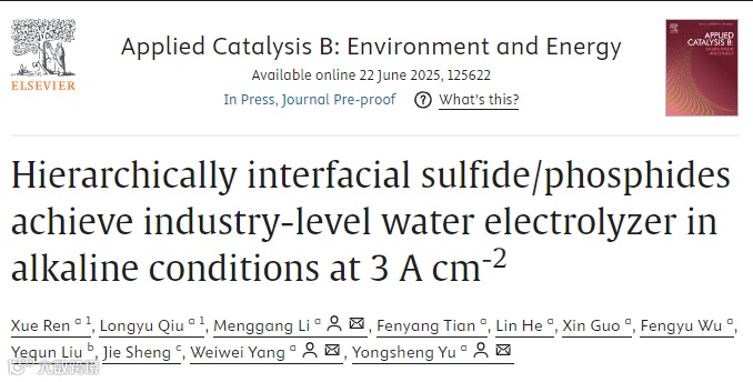 近日,哈尔滨工业大学于永生教授、杨微微副教授、李蒙刚教授团队在Applied Catalysis B: Environment and Energy期刊上发表了题为“Hierarchically interfacial sulfide/phosphides achieve industry-level water electrolyzer in alkaline conditions at 3 A cm−2”的研究论文(DOI: 10.1016/j.apcatb.2025.125622)。实现超高电流密度水电解槽是工业生产氢的关键。过渡金属硫化物/磷化物(TMSs/TMPs)具有成本低、储量丰富、电子构型可调等优点,是氢、氧析出反应(HER/OER)贵金属基催化剂的理想替代品。然而,M-P键的弱d-p相互作用和M-S键的强共价性限制了它们在长期水电解过程中的效率。对TMSs/TMPs异质结构电催化剂的微纳结构进行改造,可以提高水电解槽的催化性能,但对其在超高工业电流密度下的耐久性提出了挑战。在此,我们构建了一种新的CoNi2S4-Co2P/Ni12P5异质结构,具有密集的分级非晶/晶体-晶体界面位点,可以在3 A cm-2的超高电流密度下实现超耐用的碱性阴离子交换膜电解槽和工业碱性电解槽。我们证明了具有成本效益和高性能的分级界面电催化剂在工业水电解应用中的巨大潜力,这有利于促进可持续能源氢的生产。