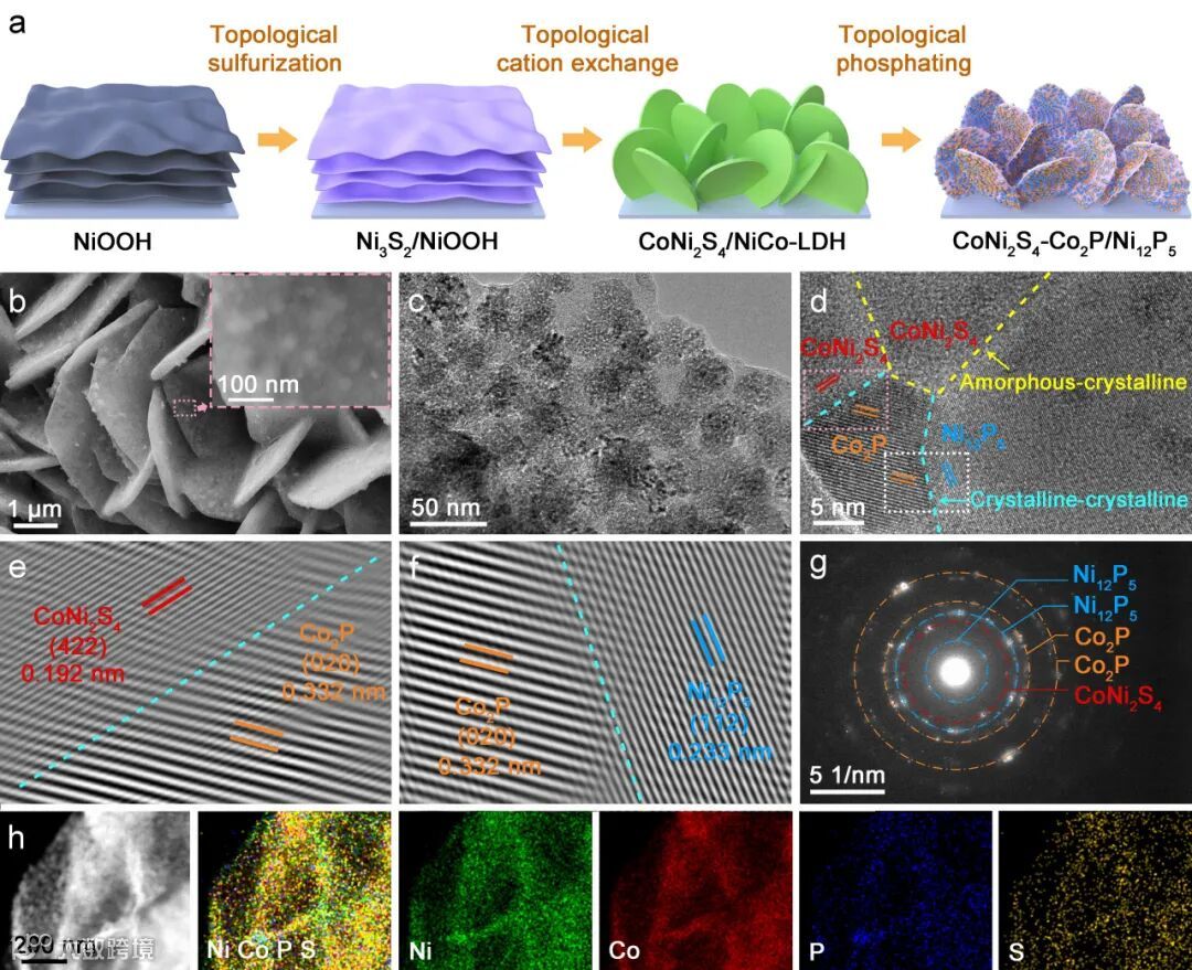 基于逐步拓扑化学策略在泡沫镍基底上制备了CoNi2S4-Co2P/Ni12P5分级界面异质结构阵列(图1a)。扫描电镜(SEM)图像显示,CoNi2S4-Co2P/Ni12P5纳米片的厚度为60~100 nm,表面含有丰富的纳米颗粒(图1b)。通过透射电子显微镜(TEM)图像和相应的粒度分析(图1c&S10),这些致密纳米颗粒的直径为35±10 nm。从高分辨率TEM(HRTEM)图像中,可以发现非晶/晶体CoNi2S4和晶体颗粒区域,形成典型的非晶/晶体-晶体界面(图1d,黄色/青色虚线)。相应的快速傅里叶变换(FFT)证实CoNi2S4-Co2P和Ni12P5-Co2P形成了晶体-晶体界面(图1e和1f,青色虚线)。因此,CoNi2S4-Co2P,CoNi2S4-Ni12P5和Ni12P5-Co2P在CoNi2S4-Co2P/Ni12P5中形成了分级的非晶/晶体-晶体界面。
