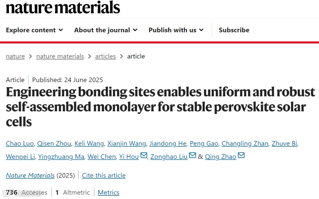 Luo, C., Zhou, Q., Wang, K. et al. Engineering bonding sites enables uniform and robust self-assembled monolayer for stable perovskite solar cells. Nat. Mater. (2025). https://doi.org/10.1038/s41563-025-02275-x.