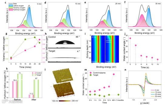O 1s的X射线光电子能谱(XPS)光谱拟合结果表明,随着羟基化蚀刻时间的增加,ITO表面的OH含量逐渐增加(图1c- f)。当处理时间增加到25分钟时,羟基氧与晶格氧的比例从16%急剧增加到71%以上(图1g),表明ITO表面形成了大量的OH基团。由于OH是最典型的亲水基团,因此水接触角可以直观地反映表面羟基的密度。如图1h所示,对照组ITO(分别用离子水、丙酮和异丙醇超声处理30分钟)的水接触角为46°,反映了其疏水性。然而,实验组ITO(经过25分钟的羟基化蚀刻处理)的水接触角低至4°。这种超亲水性证实了其表面存在丰富的OH基团。O 1s的深度分辨XPS光谱表明,这些OH基团主要分布在ITO表面(图1i)。有趣的是,通过适当调整羟基化溶液的成分和温度(见实验部分),ITO的有效羟基化甚至可以在15秒内实现,将水接触角从45.13°降低到6.17°(图1j),这将大大缩短PSC的制造时间。传统的羟基化会导致ITO表面通过物理吸附形成弱结合的OH,这为后续的SAM稳定锚定带来了隐患。确实,在DMF冲洗后,对照组样品中羟基氧与晶格氧的比例从16.4%降至11.2%,但实验组ITO的比例仅从71%降至67%(图1k),这反映了这些OH基团非常稳定地锚定在ITO表面。DMF冲洗后实验组ITO的表面电势分布几乎不变,这进一步支持了这一结论(图1l)。众所周知,通过常规UV臭氧/等离子体处理引入的OH基团是暂时的且不稳定的。随着时间的推移,这些OH会逐渐从ITO表面解离。与之形成鲜明对比的是,我们获得的OH基团可以稳定地锚定在ITO表面上,即使在三个月后,实验组ITO仍然保持其超亲水性(图1m)。