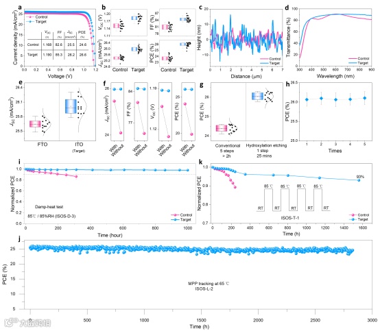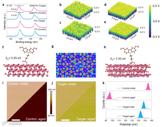 最终,器件在85%相对湿度/85°C(ISOS-D-3)下在老化1000小时后(图4i),基于实验组ITO的PSCs保持了其初始PCE的98%。热应力也可能导致SAM的解吸附,因此我们按照ISOS-T-1从室温(RT)到85℃进行了热循环老化。对照组器件的PCE在约200小时的老化过程中迅速下降(图4j)。而基于实验组ITO,更稳定的SAM锚定使该器件即使在热循环老化1600小时后也能保持其初始PCE的93%。经过65°C下的最大功率点追踪2800小时后,由于更稳定的键合位点和创造的三齿键合导致的更稳健SAM,实验组PSCs仍然可以保持初始PCE的96%(图4k)。