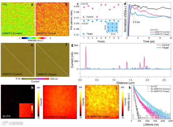 与沉积在SAM/ITO上的钙钛矿薄膜(图2i)相比,直接沉积在ITO上的钙钛矿膜的PL强度被严重淬灭(图2h)。因此,如果SAM的覆盖不够密集,局部ITO将直接与钙钛矿接触,导致界面PL淬灭。由于更均匀和更密集的SAM覆盖,与SAM/ITO(对照组)相比,钙钛矿薄膜在SAM/ITO(实验组)上表现出更强的PL强度(图2j),这与时间分辨光致发光(TRPL)结果一致(图2k)。SAM的空穴提取对PSC的光伏性能有显著影响,这空穴提取发生在皮秒尺度上。我们从皮秒瞬态吸收(TA)光谱中提取了765 nm处的载流子衰变动力学。如图2d所示,由于缺乏载流子提取,直接沉积在ITO上的钙钛矿薄膜在20皮秒内几乎没有明显的动力学衰减,但在SAM/ITO(对照)样品中可以观察到衰减。然而,在SAM/ITO(实验组)样品中,钙钛矿薄膜在2.2皮秒内即表现出快速的动力学衰减,这表明载流子界面提取效率更高由于更均匀和更密集的SAM锚定。
