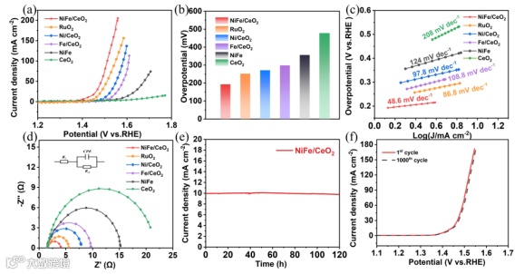 图3. 在1 M KOH溶液中,CeO2、NiFe、Fe/CeO2、Ni/CeO2、NiFe/CeO2和RuO2的OER性能。(a)扫描速率为5 mV s−1时的LSV曲线,(b)过电位,(c)Tafel斜率,(d)Nyquist图,(e)NiFe/CeO2催化剂在120小时长期耐久性测试中的极化数据,(f)NiFe/CeO2催化剂在1000次循环伏安测试后的性能。