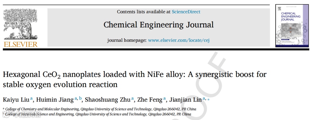 近日,来自青岛科技大学的林健健教授,在国际知名期刊Chemical Engineering Journal上发表题为“Hexagonal CeO2 nanoplates loaded with NiFe alloy: A synergistic boost for stable oxygen evolution reaction”的观点文章,通过简单溶剂热法实现了二氧化铈纳米片负载NiFe合金纳米颗粒催化剂。CeO2纳米片载体为NiFe纳米合金提供了丰富的锚定点,有效防止了NiFe纳米颗粒的聚集和迁移。此外,NiFe合金促进了可逆的Ce4+/Ce3+氧化还原循环,协同促进了催化剂的活性。这项工作不仅为设计高性能OER催化剂提供了宝贵见解,同时对可持续水分解和可再生能源技术的发展做出了贡献。