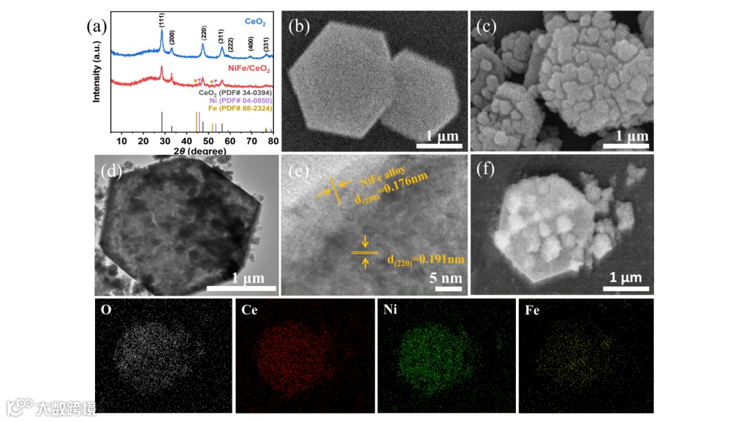 图1. (a)CeO2和NiFe/CeO2的XRD图谱。(b)CeO2的SEM。NiFe/CeO2的结构表征,(c)SEM,(d)TEM,(e)HRTEM,(f)EDS。