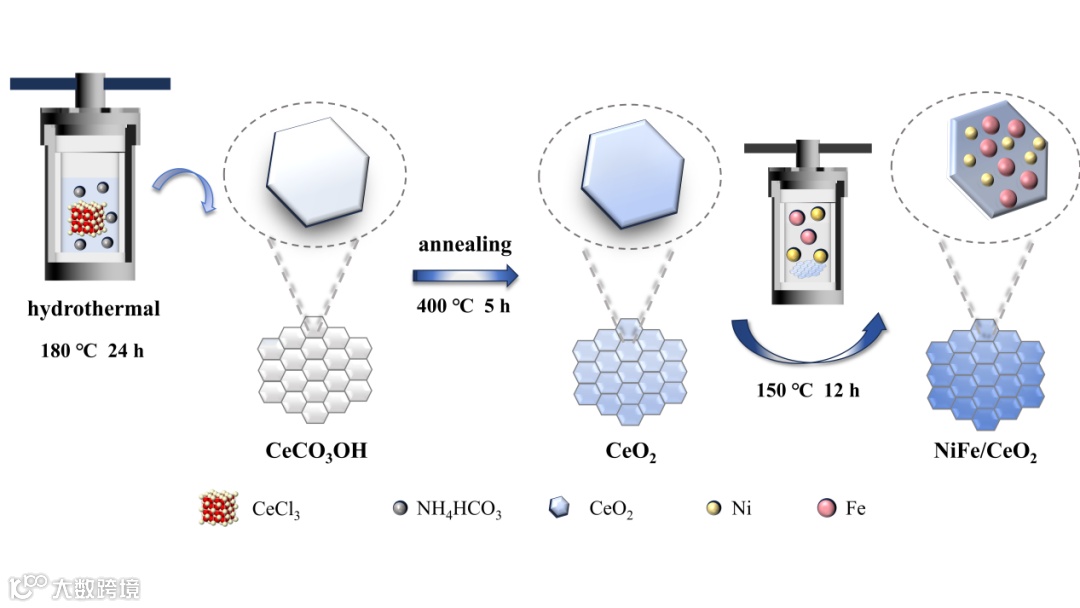 图1. NiFe/CeO2催化剂的合成路线示意图。