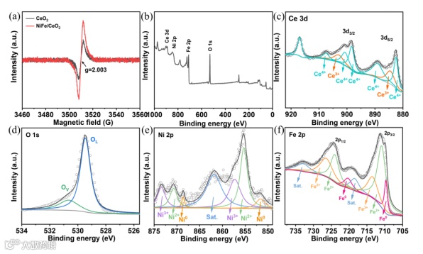 图2. (a)CeO2和NiFe/CeO2的EPR光谱。NiFe/CeO2的XPS光谱。(b)全谱,高分辨率XPS光谱包括(c)Ce 3d、(d)O 1s、(e)Ni 2p及(f)Fe 2p。