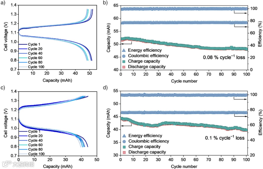 图3. a) 基于活性HBCs的动态液流电池充放电循环测试的容量电压曲线图(理论最高容量:100 mAh);b) 基于活性HBCs的动态液流电池充放电循环测试的库伦效率、能量效率、充放电容量图(理论最高容量:100 mAh);c) 基于活性线性聚合物的动态液流电池充放电循环测试的容量电压曲线图(理论最高容量:100 mAh);d) 基于活性线性聚合物的动态液流电池充放电循环测试的库伦效率、能量效率、充放电容量图(理论最高容量:100 mAh)。