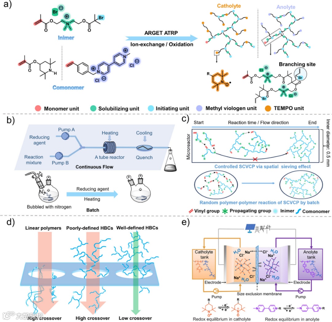 图1. 基于氧化还原活性HBCs的液流电池整体概念。a) 单体引发剂与功能共聚单体通过SCVCP和后修饰制备氧化还原活性HBCs的示意图;b) 利用连续流反应器和传统批次反应器分别合成氧化还原活性HBCs的示意图;c) 利用微反应器的空间筛分效应优化SCVCP的过程与批次反应器中SCVCP过程的示意图;d) 为抑制交叉而精心设计的氧化还原活性聚合物;e) 基于氧化还原活性HBCs的液流电池示意图,包括一个电化学反应腔室和两个电解液储罐。阳极电解液和阴极电解液中活性物质通过透析膜隔开:该膜可截留HBCs,同时允许支持电解质的离子通过。在充/放电循环期间,含氧化还原活性HBCs的溶液从储液罐连续输送至电化学反应腔室,在其中发生氧化还原反应。阴极电解液中活性物种为TEMPO自由基,阳极电解液中活性物种为紫精衍生物。