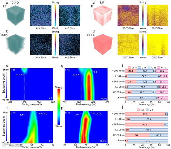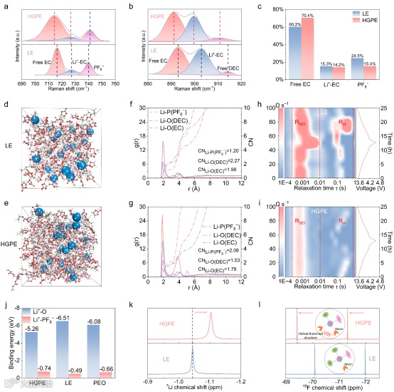 图3多尺度实验与理论模拟揭示HGPE的溶剂化重构机制。拉曼光谱显示PF6−峰从 740.1 cm−1移至 741.0 cm−1,表明 HGPE 中阴离子与电解质的相互作用增强(图3a-c),I(PF6−/自由EC)比值降至0.22(LE:0.41),证实阴离子主导溶剂化鞘形成。分子动力学模拟(图3d-g)结合径向分布函数证明HGPE中Li+−P(PF6−)配位峰强度反超Li+−O(DEC/EC),配位数显著提升。弛豫时间分布(DRT)分析揭示HGPE体系SEI 的阻抗(RSEI)表现出高度可逆的弛豫过程(图3h-i)。结合能计算定量显示螺旋拓扑削弱Li+-溶剂作用(−5.26 eV vs. LE: −6.51 eV),同时强化Li+−PF6−结合(−0.74 eV)(图3j)。固态核磁(7Li和19F NMR)中Li+化学位移负移(−1.10359 ppm)及F核去屏蔽效应共同印证阴离子内鞘配位(图3k-l)。该螺旋支化拓扑通过固定阴离子构建双螺旋传输通道,促成富LiF界面,同步提升锂金属兼容性与4.6V高压稳定性。