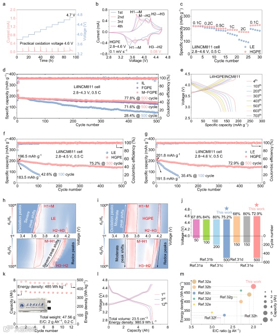 图5证实HGPE在高能量密度LMB中的电化学性能。电化学浮动分析(EFA)揭示HGPE在4.6 V下漏电流趋近于零(LE于4.3 V失控)(图5a)。循环伏安法(CV)证实阴离子富集CEI抑制高镍相变(图5b);室温长循环显示Li||NCM811电池在4.6 V截止电压下循环500次容量保持率72.9%(图5g)。差分容量(dQ/dV)曲线峰值稳定性印证可逆氧化还原动力学(图5h-i)。更在6 Ah锂金属软包电池中实现485 Wh kg−1超高能量密度,于严苛条件(贫电解液2 g Ah−1、低N/P比2.5和4.6 V高压)下循环10次容量保持率97.6%(图5k-l),性能边界超越近年报道体系(图5m),奠定实用化高能锂金属电池新标准。