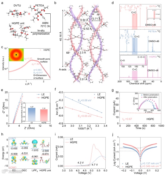 图2揭示了螺旋支化凝胶电解质(HGPE)的分子拓扑设计-结构-性能关联。通过原位共聚醚类单体DVTU与丙烯酸酯交联剂PETEA,构建双螺旋拓扑网络(图 2a)。单晶 X 射线衍射(SCXRD)解析证实了原子级螺旋构象,相邻DVTU以68°二面角扭转形成40.16Å螺距通道,弱氢键(C−H⋯O=C, 2.3−2.54Å)稳定双螺旋骨架(图2b)。广角X射线散射(WAXS)显示1.27/1.53Å−1特征峰证实纳米级有序通道(图2c),固态 13C 核磁共振(NMR)中69 ppm双峰印证螺旋应变效应(图2d);该设计赋予HGPE接近液态电解质的离子电导率(1.31 mS cm−1,图2e)、超低活化能(0.05 eV,图2f)及高Li+迁移数(tLi+=0.67,图2g),归因于双螺旋隧道限域传输与阴离子主导溶剂化结构。密度泛函理论(DFT)计算进一步揭示其具有较高的抗氧化能力,线性扫描伏安法(LSV)验证4.7 V超高电化学窗口(图2i),有望实现电池在高截止电压下稳定循环。