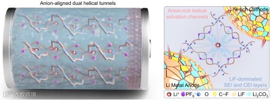本研究提出螺旋支化分子拓扑工程策略,通过精准构筑具有螺旋扭曲构象的聚合物网络,利用给/吸电子基团协同调控电荷分布,诱导形成阴离子富集型螺旋溶剂化通道。该独特结构驱动阴离子优先分解,构建出高稳定性的富LiF电极界面;同时基于双螺旋隧道的限域离子通道显著提升锂离子传输动力学,同步实现高离子传导能力与优异离子迁移特性。螺旋限域机制有效抑制高电压工况下的溶剂氧化分解与过渡金属溶出,赋予锂金属电池高压循环稳定性与实用化软包电池性能。该工作突破传统电解质设计边界,为下一代高能量密度锂金属电池确立了新范式。