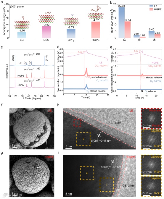 图6 揭示HGPE对高镍正极的革命性保护。DFT计算证实螺旋C−O−C位点对过渡金属吸附能(−4.87 eV)明显低于PF6−/EC/DEC(图6a),驱动阴极表面形成抗氧化保护层。ICP-OES实测循环后Ni/Mn溶出量较LE降低32.5%/43.7%(图6b),XRD中(003)/(104)峰强度比提升至1.362(LE:1.225),证实结构稳定性得到增强(图6c)。原位差分电化学质谱分析(DEMS)捕获LE体系4.23 V即爆发氧释放,而HGPE将氧析出起始电压推至4.37 V并完全抑制O2生成(图6d-e)。扫描电子显微镜(SEM)和透射电子显微镜(TEM)显示HGPE循环后正极没有出现裂纹(LE出现明显的表面裂纹),CEI厚度仅3 nm(LE:8 nm)且保持层状结构(图6f-i)。