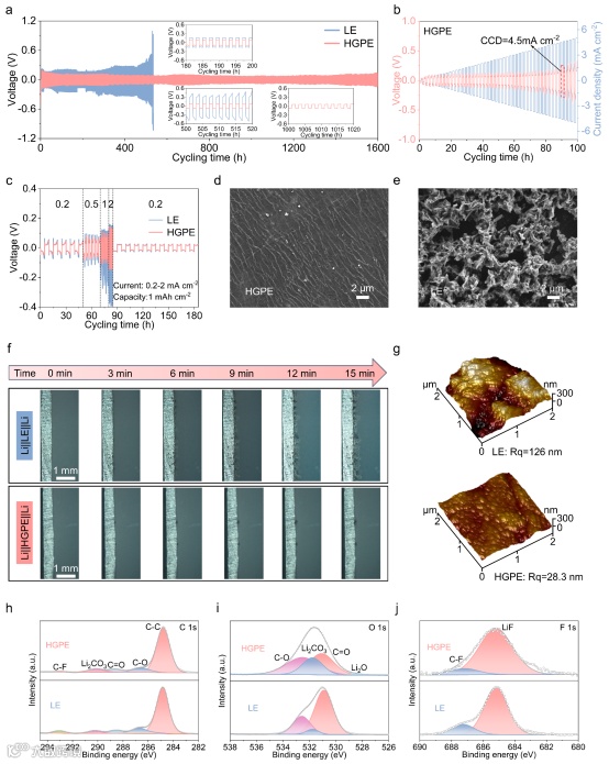 图4证实HGPE赋予锂金属阳极革命性提升。Li||Li 对称电池在 0.5 mA cm−2的电流密度下稳定循环1600 h(LE:450 h失效),并且实现了 4.5 mA cm−2的临界电流密度,倍率性能(0.2−2 mA cm−2)过电势显著降低(图4a-c)。原位电化学光学显微镜捕获HGPE体系均匀锂沉积形貌(图4f),原子力显微镜(AFM)定量显示沉积层粗糙度降至28.3 nm(图4g)。X 射线光电子能谱(XPS)揭示SEI组分颠覆性转变,LiF含量激增(F 1s: 685.2 eV)、Li2CO3倍增、Li2O特征峰显现(528.4 eV),有机组分(C−O/C=O)占比减少(图4h-j),构建LiF主导SEI;该界面源于螺旋通道内PF6−优先分解,其高离子电导与机械强度协同抑制枝晶,为高负载实用化电池奠定基础。