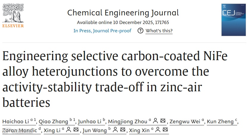 通过工程化设计选择性碳涂层NiFe合金异质结,克服锌空气电池中活性与稳定性的权衡矛盾