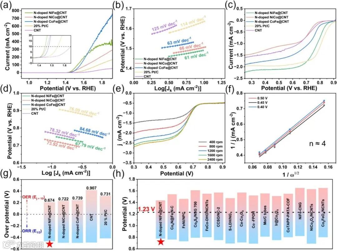图4. (a) 催化剂氧析出反应的线性扫描伏安曲线及(b)塔菲尔图。(c) 催化剂氧还原反应的线性扫描伏安曲线及(d)塔菲尔图。(e) N-doped NiFe@CNT在不同转速下的ORR极化曲线及(f) Koutecky-Levich (K-L)图。(g) 本研究评估的催化剂OER过电位与ORR半波电位的对比分析。(h) 本催化剂与近期报道的电催化剂的双功能催化性能比较。
