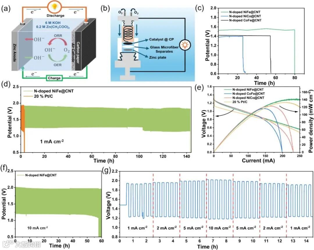 图6. (a)水系R-ZABs和(b)Swagelok电池模型示意图。(c)基于不同催化剂的ZABs开路特性。(d)分别用N-doped NiFe@CNT和20% Pt/C组装的ZABs在1mA cm-2条件下的循环稳定性。(e) 基于不同催化剂的ZAB放电极化曲线及对应功率密度。(f) N-doped NiFe@CNT组装的ZAB在10 mA cm-2电流密度下的循环稳定性。(g) N-doped NiFe@CNT组转的ZAB在不同电流密度下的放电曲线。