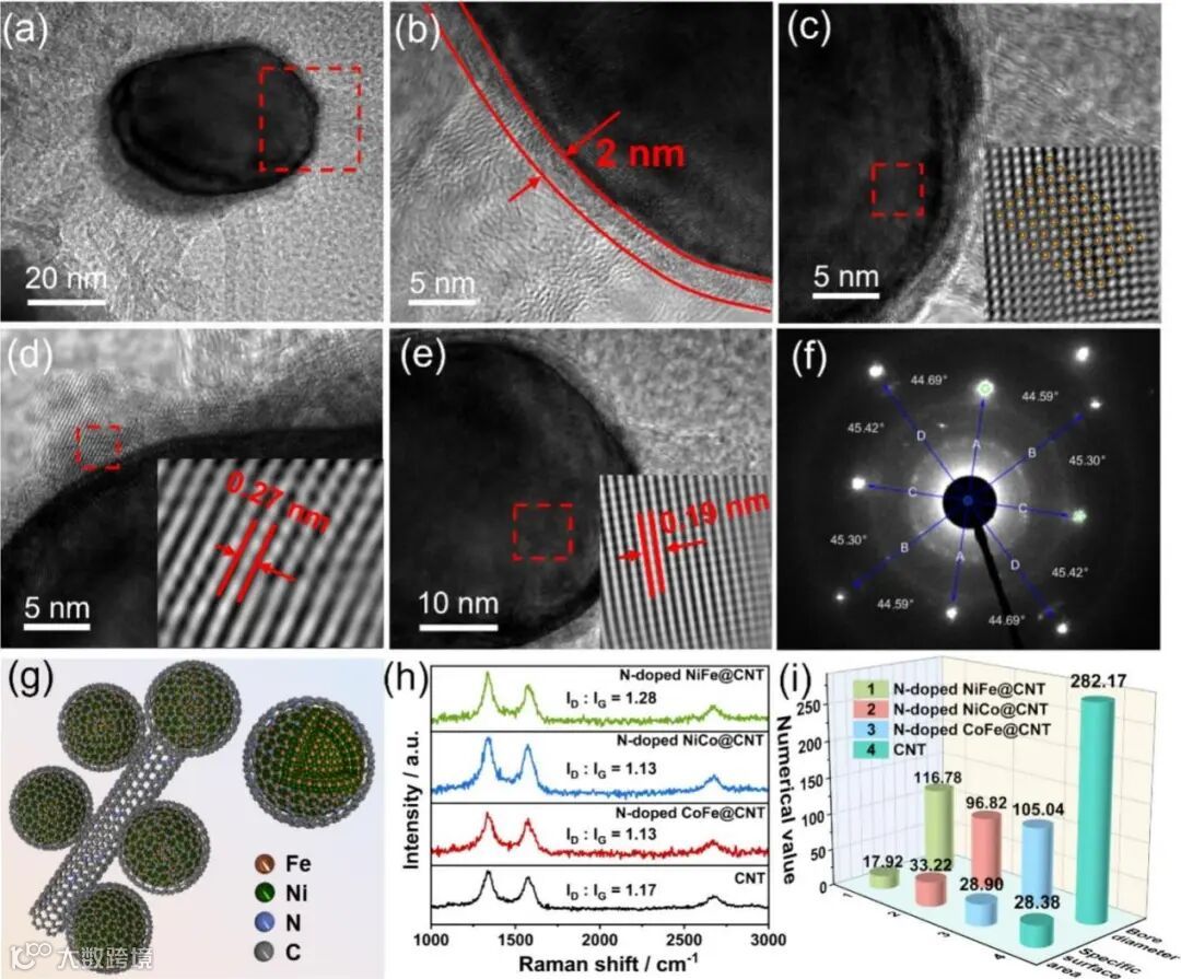 图2. N-doped NiFe@CNT的高分辨率透射电子显微镜图像:(a)颗粒形态;(b)薄碳包覆层(~2 nm);(c)对应NiFe(100)晶面的FFT衍射图案;(d, e)石墨碳壳与NiFe合金相的晶格条纹。(f) N-doped NiFe@CNT的选区电子衍射(SAED)图谱。(g) N-doped NiFe@CNT尖端锚定网状包裹纳米胶囊结构示意图。(h) 四种催化剂的拉曼光谱。(i) 四种催化剂的BET比表面积与平均孔径对比。