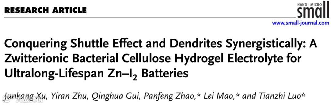 近日,来自中国科学技术大学的骆天治教授、毛磊教授与电子科技大学的赵攀峰教授合作,在国际知名期刊Small上发表题为“Conquering Shuttle Effect and Dendrites Synergistically: A Zwitterionic Bacterial Cellulose Hydrogel Electrolyte for Ultralong-Lifespan Zn–I2 Batteries”的研究文章。该文章设计并报道了一种新型的聚两性离子细菌纤维素水凝胶电解质(SBC),该电解质通过精妙的分子结构设计,成功实现了对锌碘电池正极和负极界面的同步优化。文章深入分析了SBC电解质如何通过其独特的化学结构抑制多碘化物穿梭并引导锌均匀沉积,最终使锌碘电池实现了超过20,000次的超长循环寿命。