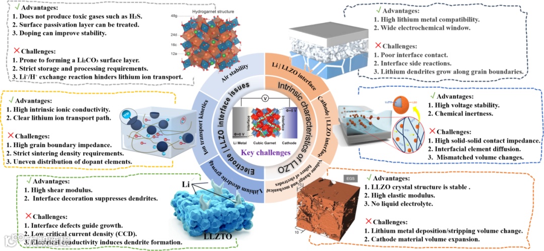 石榴石型LLZO固态电解质虽具备高离子电导率、宽电化学窗口及良好的锂金属相容性等优势,但其实际应用仍面临多重核心挑战。首先,电极|LLZO界面接触不良是主要瓶颈:阳极侧锂金属与LLZO的固-固接触导致界面空洞形成,引发局部电流集中和锂枝晶生长;阴极侧(如NCM材料)与LLZO的物理接触不充分,显著增加界面阻抗并限制离子传输。其次,界面副反应(如LLZO表面与空气中CO₂/H₂O反应生成Li₂CO₃/LiOH钝化层)会阻碍锂离子迁移,加剧界面退化。此外,电极体积变化引发的机械失效(如锂沉积/剥离过程中的应力积累、阴极材料循环膨胀)可能导致电解质开裂或界面剥离,加速电池失效。LLZO本身的本征特性问题,包括晶界电阻高、烧结密度不足及电子电导率失控,进一步为锂枝晶穿透提供通道,威胁电池安全性。