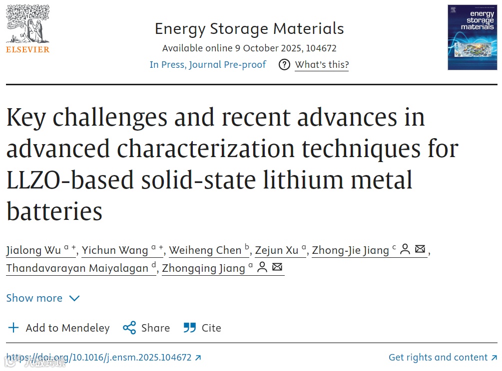 近日,来自浙江理工大学的蒋仲庆教授与华南理工大学的蒋仲杰教授合作,在国际知名期刊 Energy Storage Materials 上发表题为“Key challenges and recent advances in advanced characterization techniques for LLZO-based solid-state lithium metal batteries”的观点文章。该观点文章系统梳理了石榴石SSE面临的关键挑战,强调了先进表征技术的迫切需求,同时强调先进表征技术在揭示电池运行过程中界面动态演变与结构变化中的核心作用,回顾了这些技术在石榴石型固态电解质领域取得的关键突破。