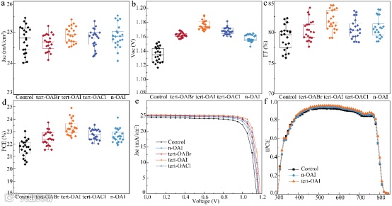 本文制备了正型钙钛矿太阳能电池结构,图中分别显示了有无钝化PSC的光伏参数分布(PCE、Jsc、Voc和FF)。无修饰器件的平均PCE约为22.23%,短路电流密度(Jsc)约为24.77 mA cm−2,开路电压(Voc)约为1.14 V,填充因子(FF)约为79.06%。tert-OAI改性器件的性能显示,平均PCE约为24.11%,Jsc约为24.92 mA cm−2,开路电压(Voc)约为1.18 V,填充因子(FF)约为81.83%。tert-OAI钝化后,器件效率从22.23%提升至24.11%,开路电压提升超过40 mV。tert-OABr、tert-OACl和n-OAI改性的PSCs的平均J-V性能也显著提高,平均PCE分别提高至22.66%、23.24%和23.25%。