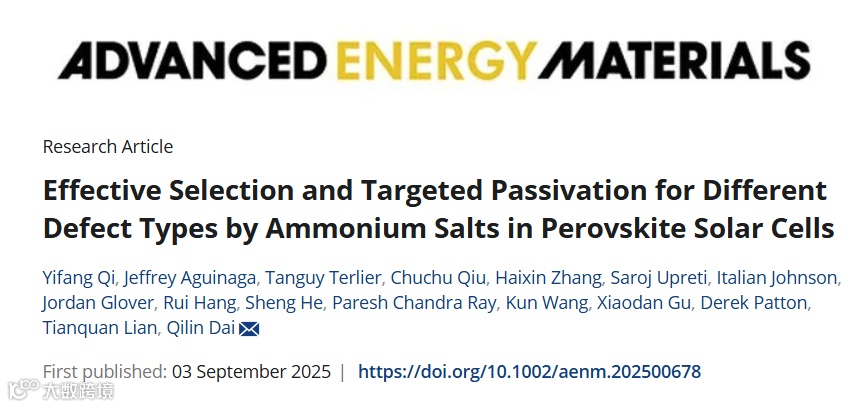 近日,来自杰克逊州立大学的戴其林教授课题组,在国际知名期刊Advanced Energy Materials上发表题为“Effective Selection and Targeted Passivation for Different Defect Types by Ammonium Salts in Perovskite Solar Cells”的观点文章。该观点文章分析了在铵盐结构里烷基链结构以及卤素离子对器件性能的影响,以及针对钙钛矿薄膜不同缺陷类型的钝化研究。