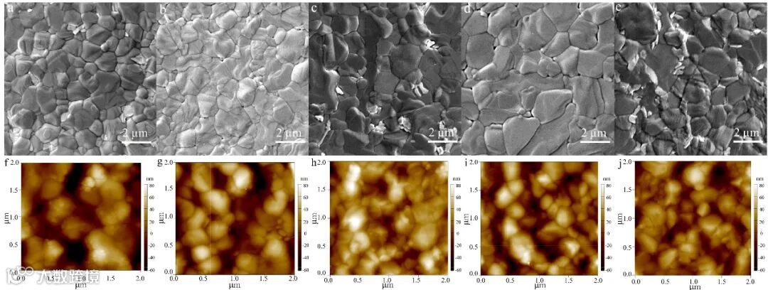 Figure 2. a–e) The top-view SEM images of perovskite without passivation (a), with tert-OABr (b), tert-OACl (c), tert-OAI (d), and n-OAI (e); f–j) The AFM images of perovskite without passivation (f), with tert-OABr (g), tert-OACl (h), tert-OAI (i), and n-OAI (j).