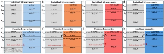 Figure 5 a-d. The individual measurements of energy levels of perovskite films with n-OAI(a), tert-OAI(b), tert-OABr(c) and tert-OACl(d) passivation; e-f. The corresponding band-bending energy level diagram; g-h. The combined energetics of perovskite films.
