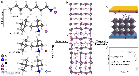 Figure 1. a) The structure of passivation ammonium salts (n-OAI, tert-OAI, tert-OABr, and tert-OACl); b) The vacancy defect types (from top to bottom: VFA, VPb, and VI) of perovskite films; c) The structure of PSCs with passivation; d) The J-V curves of devices with and without tert-OAI passivation.