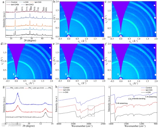 Figure 3 a. The XRD patterns of perovskite films with and without passivation; b-f. The GIWAXS maps of perovskite films without passivation (b) with tert-OAI (c), n-OAI (d), tert-OABr (e) and tert-OACl (f); The XRD patterns of PbI2 films with n-OAI and tert-OAI passivation; h-i. The FTIR spectra of perovskite films with and without tert-OAI and n-OAI passivation.