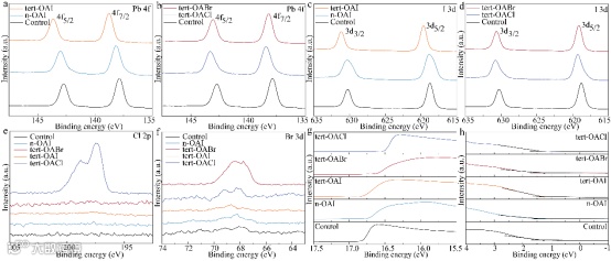 Figure 4. a,b) The XPS-Pb spectra of perovskite films with tert-OAI, n-OAI (a), and with tert-OABr and tert-OACl (b); c,d) The XPS-I spectra of perovskite films with tert-OAI, n-OAI (c), and with tert-OABr and tert-OACl (d); e) The XPS-Cl spectra of perovskite films with and without passivation; f) The XPS-Cl spectra of perovskite films with and without passivation; g,h) The high and low cutoff regions of UPS spectra of perovskite films with and without passivation layers.