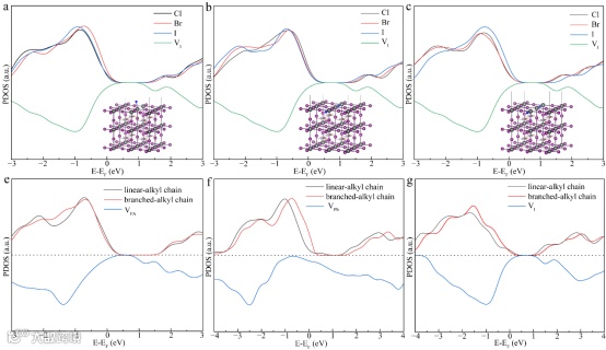 Figure 6. a) The PDOS of halogen ions on the surface of perovskite films with VI; b) The PDOS of halogen ions completely fill the VI in the perovskite films; c) The PDOS of halogen ions partially fill the VI in the perovskite films; e–g) The PDOS of perovskite films with VFA(e), VPb(f ), and VI(g) after linear-alkyl chain and branched-alkyl chain passivation.