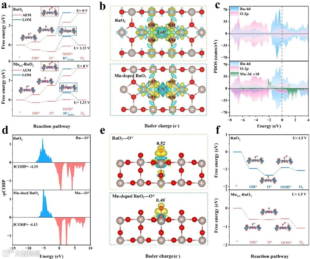 图 3.(a)RuO2和 MnSA-RuO2的 AEM 和 LOM 机制的反应自由能分布。(b) RuO2和 MnSA-RuO2表面的差分电荷密度。(c) RuO2和 MnSA-RuO2的投影态密度(为了便于分析,Mn单个原子的态密度放大了10倍)。(d) RuO2的 Ru-O* 和 MnSA-RuO2的 Mn-O* 键的晶体轨道汉密尔顿群。(e)吸附在 RuO2和 MnSA-RuO2上的 O* 中间体的 Bader电荷。(f)在恒电势下,AEM 对RuO2和 MnSA-RuO2的反应自由能分布。