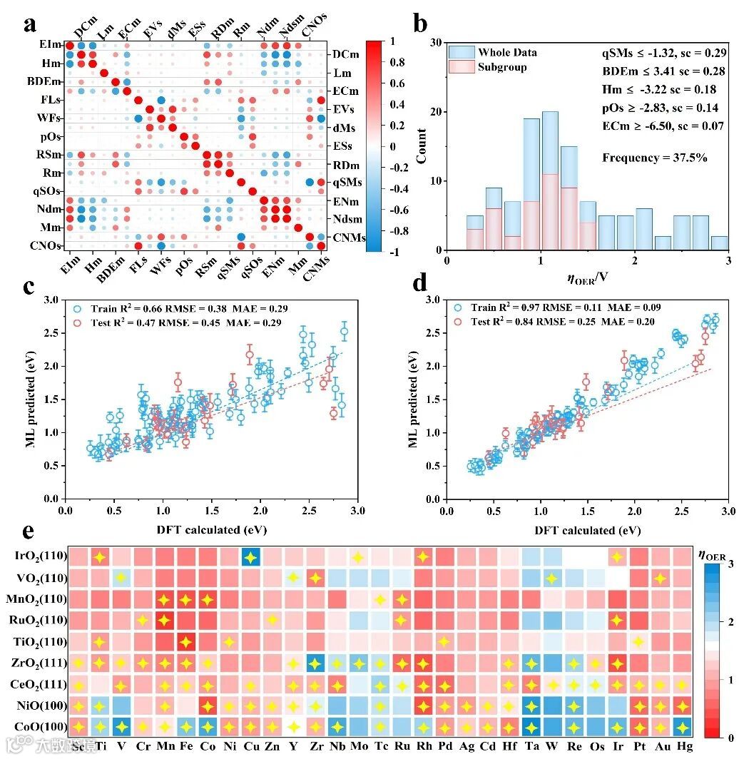 图 2.(a)特征热图。(b)子群发现(SGD)选择的子组数据集。(c)使用初始特征集训练的机器学习模型。(d)使用渐进式学习方法训练的机器学习模型。(e)高通量筛选预测的过电位。