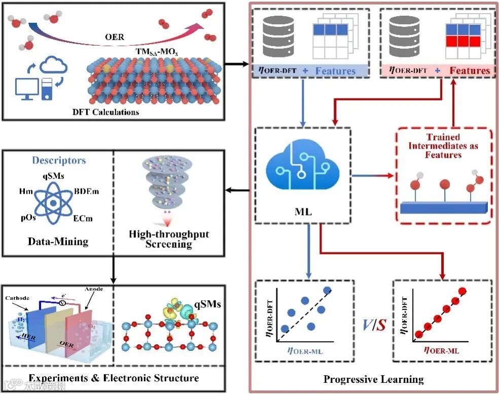 图1. 筛选单原子金属氧化物 OER 催化剂的集成工作流程示意图概述,结合了 DFT、渐进式学习、数据挖掘和实验。