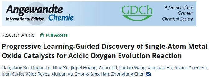 近日,浙江大学胡晓娟博士、韩仲康教授与山东理工大学徐秀娟博士携手波多黎各大学陈中方教授,在国际顶级期刊《Angewandte Chemie International Edition》上发表了题为“Progressive Learning-Guided Discovery of Single-Atom Metal Oxide Catalysts for Acidic Oxygen Evolution Reaction”的研究论文。该研究提出一种创新性的渐进式机器学习方法,有效整合了密度泛函理论(DFT)和主动学习技术,实现了对酸性析氧反应(OER)单原子金属氧化物催化剂的高效筛选,成功挖掘出多种具有显著低过电位的高性能催化剂。通过深入挖掘关键描述符并结合实验验证,研究团队进一步揭示了催化性能的内在调控机制,为在酸性环境下开发高效功能材料提供了崭新的理论指导和实践路径。
