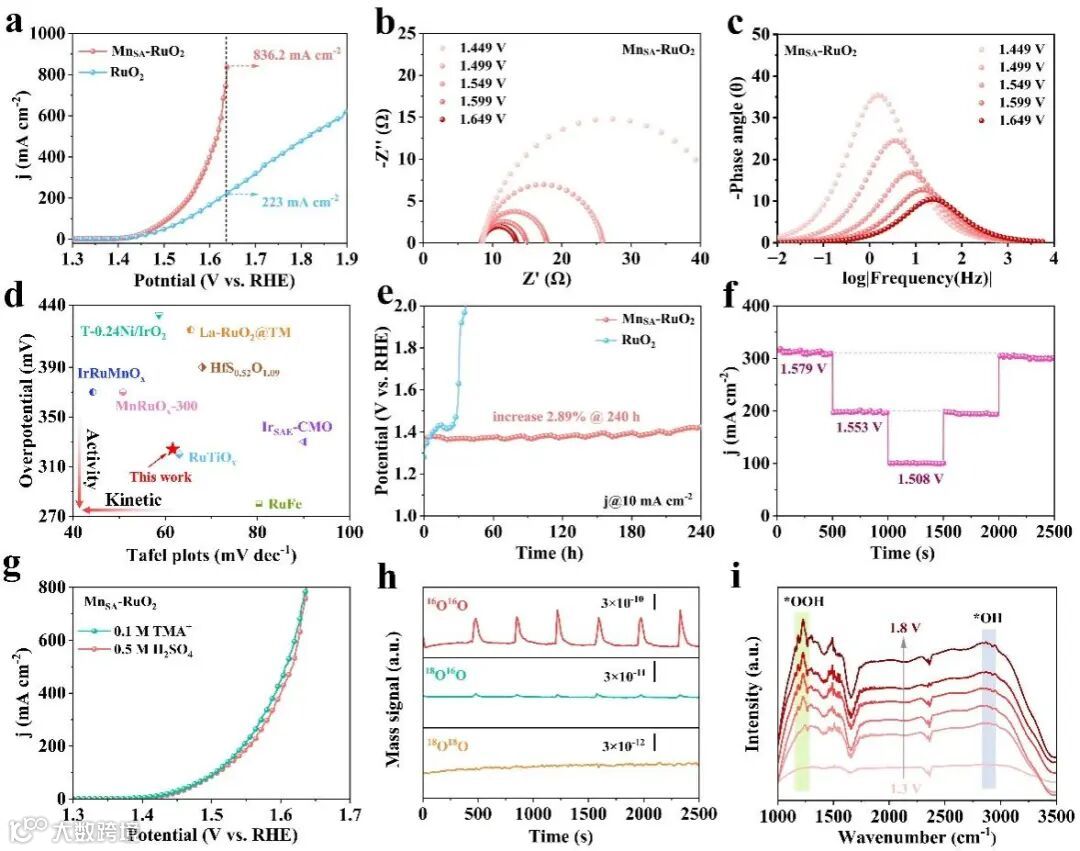 图 4. (a) MnSA-RuO2和 RuO2在 0.5 M H2SO4 溶液中的线性扫描伏安(LSV)曲线。(b) MnSA-RuO2的电化学阻抗谱(EIS)Nyquist 图及其等效电路模型。(c) MnSA-RuO2的 Bode 相位图。(d) 报道的多种催化剂与本工作制备的 MnSA-RuO2在 200 mA cm-2 电流密度下所达电位和 Tafel 斜率值的对比图。(e) MnSA-RuO2和 RuO2在 10 mA cm-2 电流密度下持续240小时的恒电流计时电位曲线(Chronopotentiometry)。(f) MnSA-RuO2的多步恒电流计时安培曲线(Chronoamperometry)。(g) MnSA-RuO2在是否添加TMA⁺条件下于 0.5 M H2SO4中的 LSV 曲线。(h) 在循环伏安(CV)过程中收集的 32O、34O 和 36O 的差示电化学质谱(DEMS)信号。(i) MnSA-RuO2析氧反应过程的原位 ATRSEIRAS 红外光谱图。