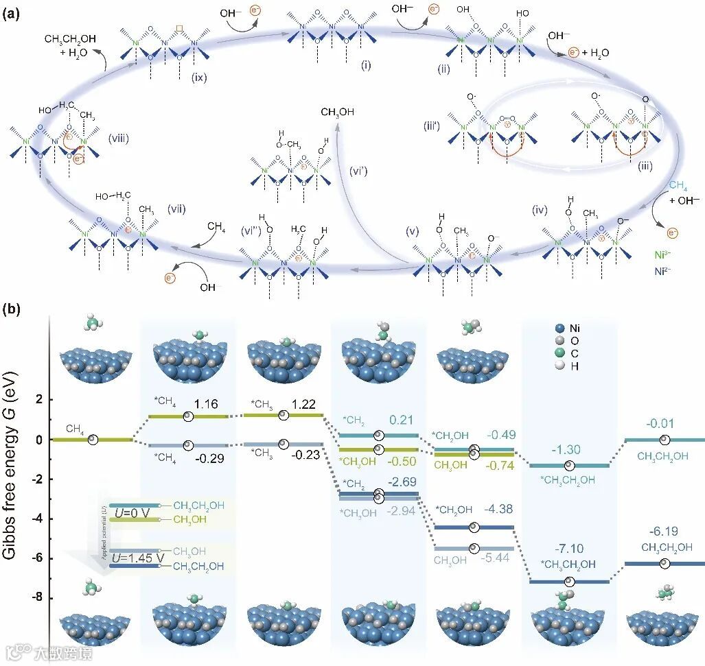 电位调控:密度泛函理论计算显示,低电位下甲烷更易羟基化生成甲醇;高电位则促进CH₃中间体进一步脱氢,经OCH₂路径生成乙醇,而乙醇脱附能垒较高(0.91 eV),易被深度氧化为乙酸,这也解释了产物分布的电位依赖性。