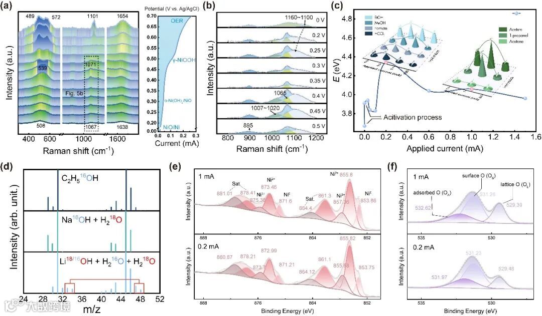 图2 NiO/Ni催化EOM机理分析。(a)不同电位下NiO/Ni催化剂的拉曼光谱(右图附相应线性扫描伏安曲线)及其特征峰区域的局部放大图 (b);(c) 电解前后NiO/Ni催化剂的UPS光谱价带边位置(Eedge),插图为不同工作电流下含氧化合物的产率;(d) NiO/Ni催化剂在含18O电解液中、1 mA电流下反应24小时所得乙醇的质谱图及典型乙醇质谱图;(e) 在1 mA和0.2 mA下电解后NiO/Ni催化剂的Ni 2p XPS谱图及 (f) O 1s XPS谱图。