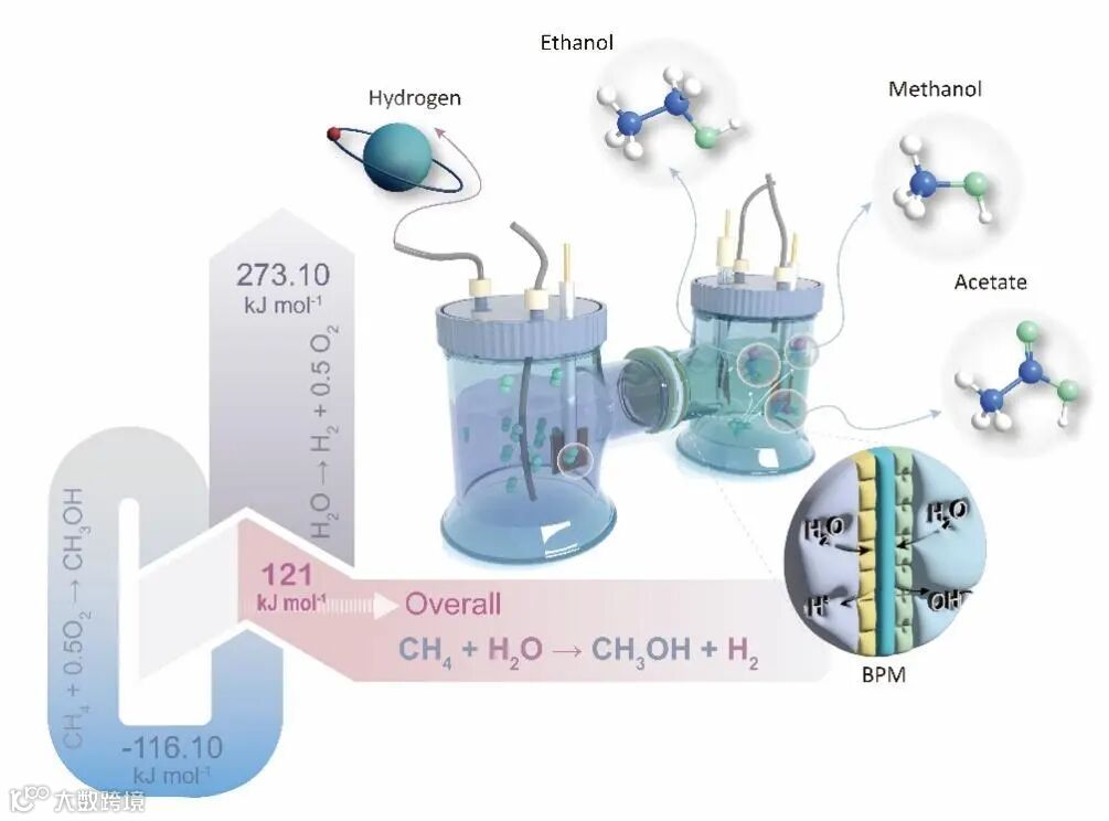 更具吸引力的是其经济与环境价值:相较于传统电解槽,该体系通过利用废酸/碱液的电化学中和能,不仅降低了废水处理成本,还将甲烷这一温室气体转化为市场价值更高的液态化学品(如乙醇、乙酸),同时产出绿氢。该成果有望为甲烷资源化、工业废水利用与绿氢生产的协同发展开辟新的航道。