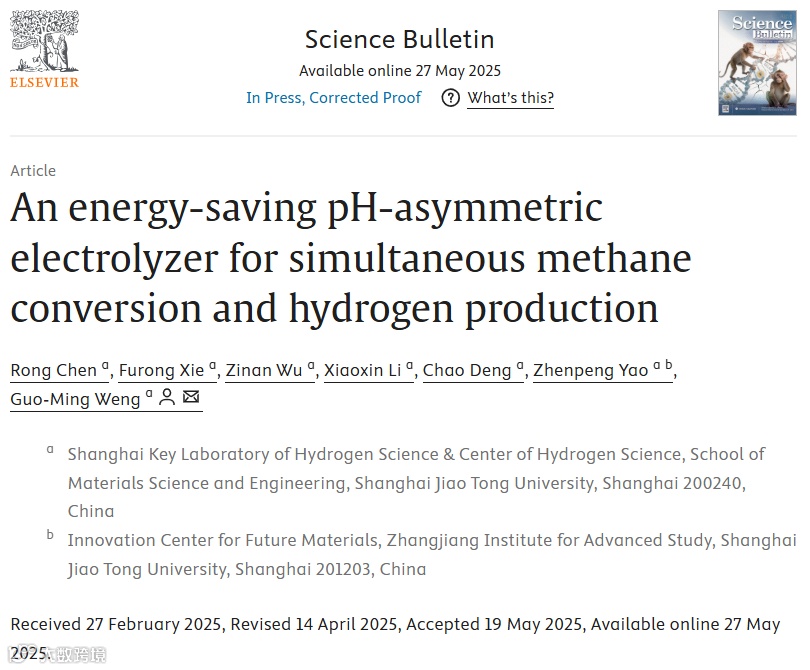 在“双碳”目标推动下,如何实现温室气体甲烷的减排与资源化利用,同时高效生产清洁能源,成为全球能源与环境领域的核心挑战。近日,上海交通大学材料科学与工程学院氢科学中心翁国明副教授课题组在《Science Bulletin》发表的最新研究,为这一难题提供了新的解决方案。他们研发的节能型 pH 不对称电解槽,通过引入电化学中和能,在常温常压下实现了甲烷向高附加值液态产物的定向转化,同时协同利用工业废酸/碱液高效制氢,能耗较传统技术降低37%,为“甲烷减排-废水处理-绿氢生产”一体化提供了全新路径。