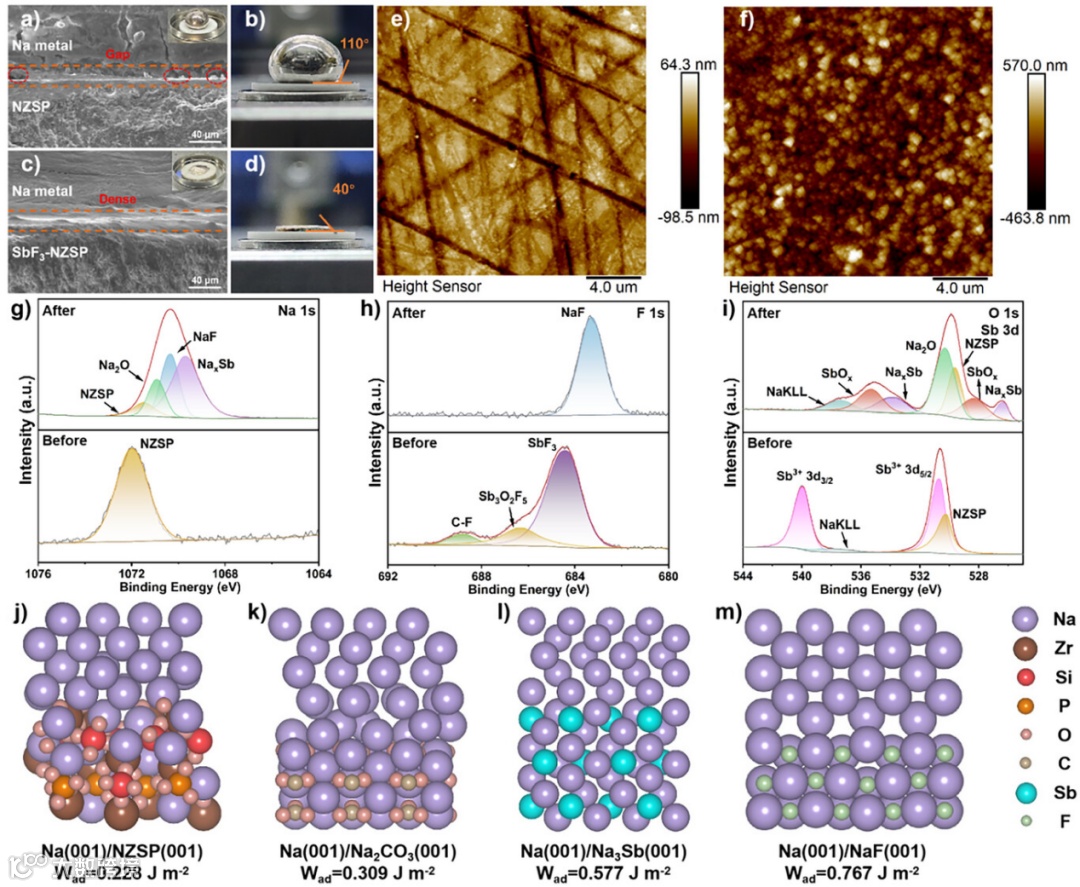 通过比较熔融Na在NZSP与SbF3-NZSP片表面的接触状态,表明Na金属与SbF3-NZSP具有更好的浸润性,更易形成致密界面。AFM测试结果表明,SbF3层均匀覆盖了NZSP表面的划痕,更有利于电解质片与熔融钠的润湿。SbF3修饰的NZSP电解质表面原位形成了富含NaF、Na2O及NaxSb合金的SEI层。
