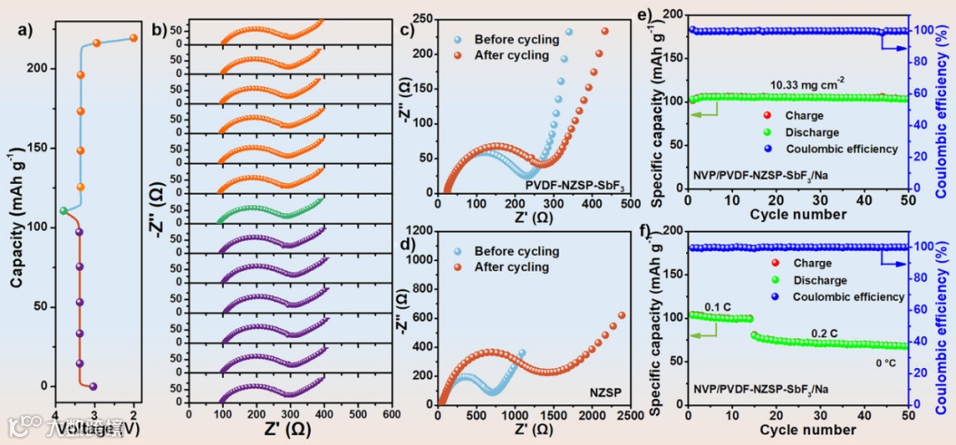 图6. NVP/PVDF-NZSP-SbF3/Na全电池的原位EIS、高负载及低温测试