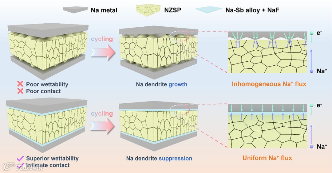 图4. NZSP和/SbF3-NZSP界面沉脱钠示意图。