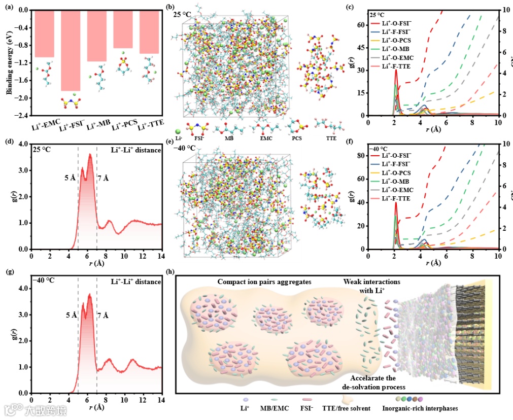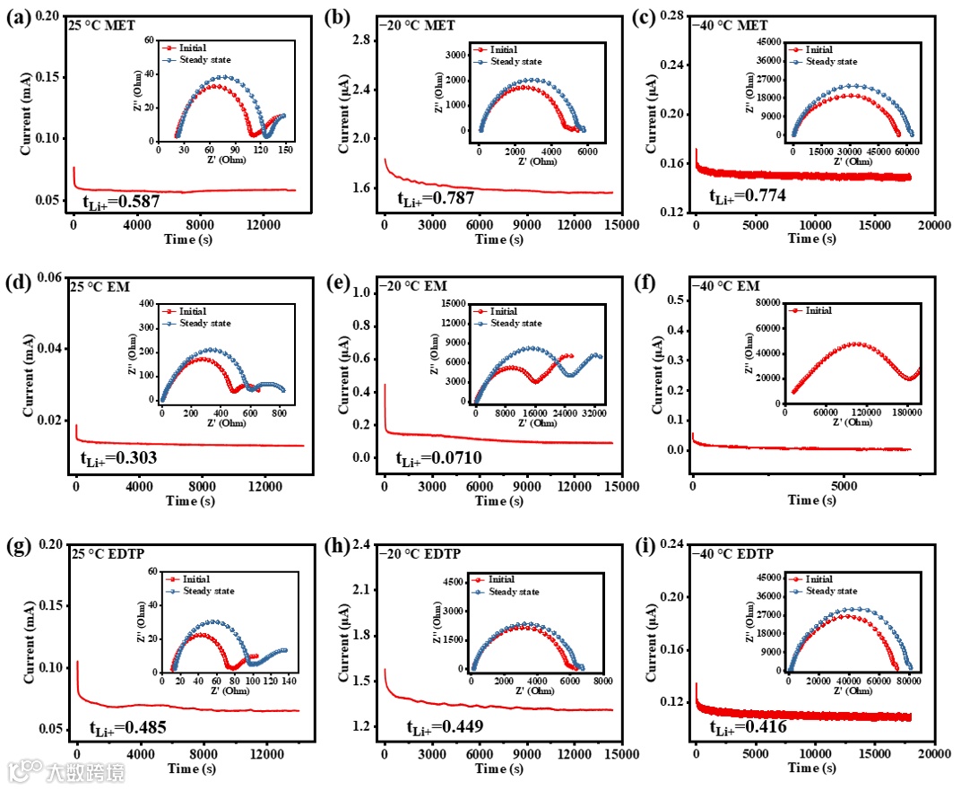 溶剂化结构的变化会导致锂离子迁移数的相应改变。为了确保锂盐在电解液中的溶解性和解离性,通常选择具有高介电常数的极性溶剂。通过溶剂分子与锂离子之间的配位能来克服锂盐的晶格能。锂离子较高的电荷密度使其更倾向于与溶剂分子配位,导致其有效半径增大。由此形成的溶剂化壳层的迁移速率低于阴离子,测得的锂离子迁移数通常在0.2-0.4,意味着在电解液中阴离子在电荷传导中起主要作用。随着溶剂化结构的改变,离子通过不同溶剂化壳层之间的解离/结合交换进行扩散,从而导致离子迁移数的增加。此外,根据动量守恒定律,由于电解液中存在大量游离溶剂分子,这些游离溶剂分子与离子对聚集体之间的动量交换会导致相邻的阴阳离子在相关时间尺度上优先沿同一方向移动。同时,锂离子通过交换第一溶剂化壳层中的配体向前移动,从而提高了电解液中的锂离子迁移数。因此,选择具有低介电常数的合适溶剂或反溶剂可以削弱锂离子与溶剂分子之间的结合能,调节电解液的溶剂化结构,从而提高锂离子的传输速率,并加速其在电极表面的脱溶剂化过程。采用恒电位极化法和PFG-NMR方法测定了不同温度下电解液的锂离子迁移数。在低温下,得益于结构迁移机制,CIPAs比例的增加使得设计电解液的锂离子迁移数提高至约0.8,这确保了其优异的电化学性能。