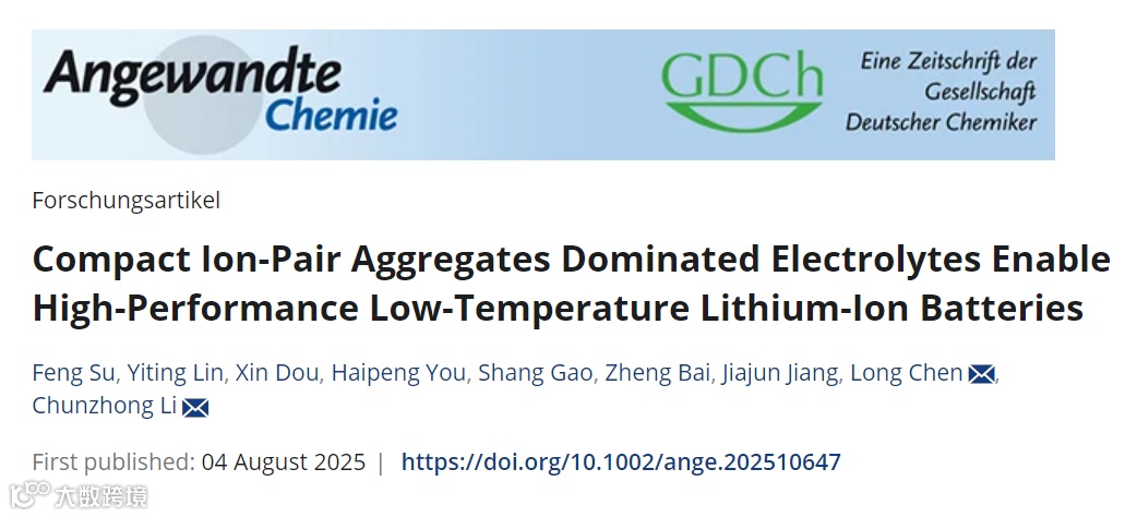 近日,华东理工大学李春忠、陈龙团队,在国际知名期刊Angewandte Chemie International Edition上发表题为“Compact Ion-Pair Aggregates Dominated Electrolytes Enable High-Performance Low-Temperature Lithium-Ion Batteries”的文章。通过采用对锂离子亲和力较弱的溶剂调控溶剂化配位环境,形成了以温度不敏感的紧凑型离子对聚集体(CIPAs)为主的溶剂化结构。这种结构不仅具有高锂离子迁移数,还能通过阴离子诱导形成富含F、N、S等无机成分的SEI,从而实现了锂离子的快速脱溶剂化和高效的电荷转移动力学,使得NCM811||石墨全电池具有良好的稳定性,并能出色适应宽温度变化。
