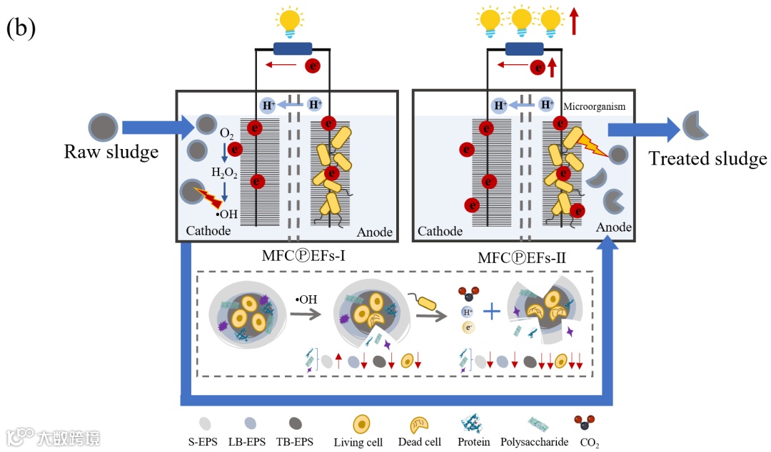 对剩余污泥进行减量化、稳定化和资源化处理处置,是实现有效污染控制的关键措施。微生物燃料电池驱动电芬顿系统(MFCⓅEFs)已被认可为一种有前途的污泥处理方法。与传统污泥处理工艺相比,MFCⓅEFs可同时在阳极实现污泥稳定化和电能转换,并在阴极提升污泥脱水性能,具有功能丰富、操作条件相对温和及安全稳定性高(常温常压条件)等优势。然而,污泥复杂的结构特性导致阳极水解反应成为限速步骤,且阴极氧化处理的效率较低。针对上述问题,构建了一种新型孪生MFCⓅEFs处理体系,该体系通过活性氧组分与微生物代谢相互耦合和反馈来调节污泥特性。